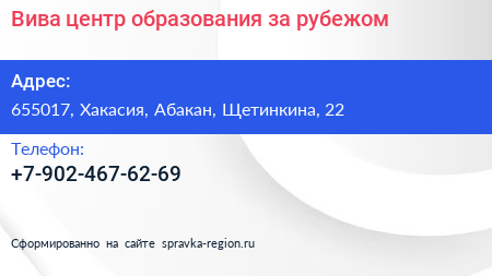 Вива, центр образования за рубежом по адресу 655017, Хакасия, Абакан, Щетинкина, 22 в дальнейшем Организация, размещена в следующих категориях:
