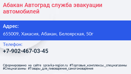 Абакан-Автоград, служба эвакуации автомобилей по адресу 655009, Хакасия, Абакан, Белоярская, 50г в дальнейшем Организация, размещена в следующих категориях: