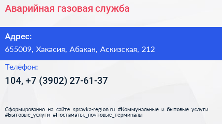 Аварийная газовая служба по адресу 655009, Хакасия, Абакан, Аскизская, 212 в дальнейшем Организация, размещена в следующих категориях: