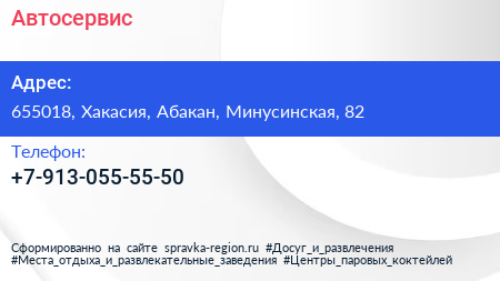 Автосервис по адресу 655018, Хакасия, Абакан, Минусинская, 82 в дальнейшем Организация, размещена в следующих категориях: