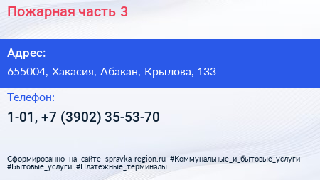 Пожарная часть №3 по адресу 655004, Хакасия, Абакан, Крылова, 133 в дальнейшем Организация, размещена в следующих категориях: