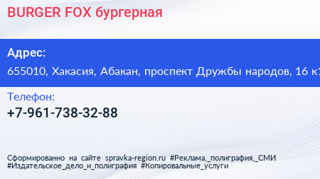 BURGER FOX, бургерная по адресу 655010, Хакасия, Абакан, проспект Дружбы народов, 16 к1 в дальнейшем Организация, размещена в следующих категориях: