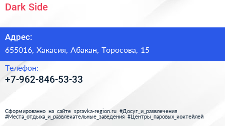 Dark Side по адресу 655016, Хакасия, Абакан, Торосова, 15 в дальнейшем Организация, размещена в следующих категориях: