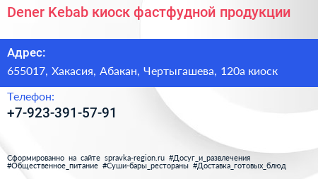 Dener Kebab, киоск фастфудной продукции по адресу 655017, Хакасия, Абакан, Чертыгашева, 120а киоск в дальнейшем Организация, размещена в следующих категориях: