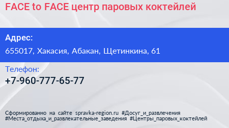 FACE to FACE, центр паровых коктейлей по адресу 655017, Хакасия, Абакан, Щетинкина, 61 в дальнейшем Организация, размещена в следующих категориях: