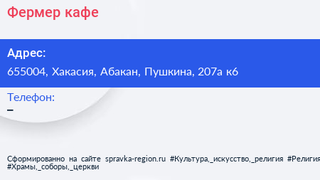 Фермер, кафе по адресу 655004, Хакасия, Абакан, Пушкина, 207а к6 в дальнейшем Организация, размещена в следующих категориях: