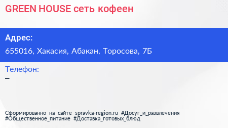GREEN HOUSE, сеть кофеен по адресу 655016, Хакасия, Абакан, Торосова, 7Б в дальнейшем Организация, размещена в следующих категориях: