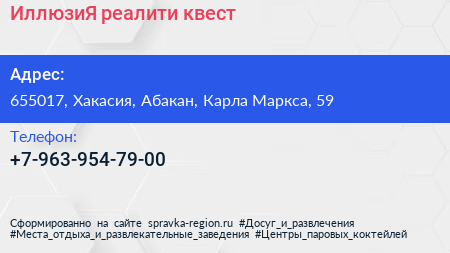 ИллюзиЯ, реалити-квест по адресу 655017, Хакасия, Абакан, Карла Маркса, 59 в дальнейшем Организация, размещена в следующих категориях: