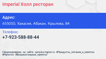 Imperial Холл, ресторан по адресу 655010, Хакасия, Абакан, Крылова, 84 в дальнейшем Организация, размещена в следующих категориях: