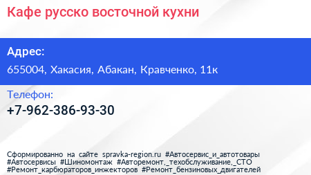 Кафе русско-восточной кухни по адресу 655004, Хакасия, Абакан, Кравченко, 11к в дальнейшем Организация, размещена в следующих категориях: