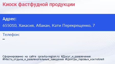 Киоск фастфудной продукции по адресу 655010, Хакасия, Абакан, Кати Перекрещенко, 7 в дальнейшем Организация, размещена в следующих категориях: