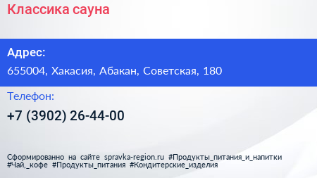 Классика, сауна по адресу 655004, Хакасия, Абакан, Советская, 180 в дальнейшем Организация, размещена в следующих категориях: