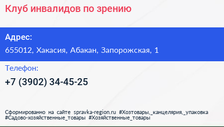 Клуб инвалидов по зрению по адресу 655012, Хакасия, Абакан, Запорожская, 1 в дальнейшем Организация, размещена в следующих категориях: