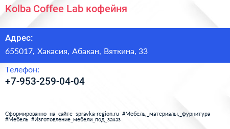 Kolba Coffee Lab, кофейня по адресу 655017, Хакасия, Абакан, Вяткина, 33 в дальнейшем Организация, размещена в следующих категориях: