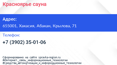 Красноярье, сауна по адресу 655001, Хакасия, Абакан, Крылова, 71 в дальнейшем Организация, размещена в следующих категориях: