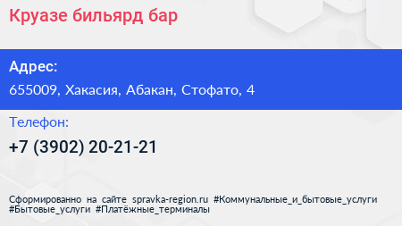 Круазе, бильярд-бар по адресу 655009, Хакасия, Абакан, Стофато, 4 в дальнейшем Организация, размещена в следующих категориях: