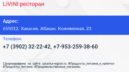 LiVINI, ресторан по адресу 655012, Хакасия, Абакан, Кожевенная, 23 в дальнейшем Организация, размещена в следующих категориях:
