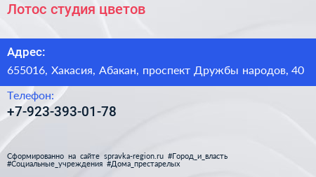 Лотос, студия цветов по адресу 655016, Хакасия, Абакан, проспект Дружбы народов, 40 в дальнейшем Организация, размещена в следующих категориях: