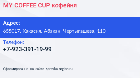 MY COFFEE CUP, кофейня по адресу 655017, Хакасия, Абакан, Чертыгашева, 110 в дальнейшем Организация, размещена в следующих категориях: