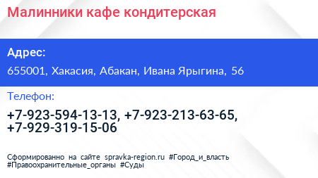 Малинники, кафе-кондитерская по адресу 655001, Хакасия, Абакан, Ивана Ярыгина, 56 в дальнейшем Организация, размещена в следующих категориях: