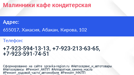 Малинники, кафе-кондитерская по адресу 655017, Хакасия, Абакан, Кирова, 102 в дальнейшем Организация, размещена в следующих категориях: