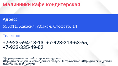 Малинники, кафе-кондитерская по адресу 655011, Хакасия, Абакан, Стофато, 14 в дальнейшем Организация, размещена в следующих категориях: