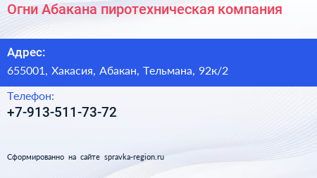 Огни Абакана, пиротехническая компания по адресу 655001, Хакасия, Абакан, Тельмана, 92к/2 в дальнейшем Организация, размещена в следующих категориях: