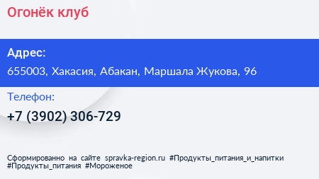 Огонёк, клуб по адресу 655003, Хакасия, Абакан, Маршала Жукова, 96 в дальнейшем Организация, размещена в следующих категориях: