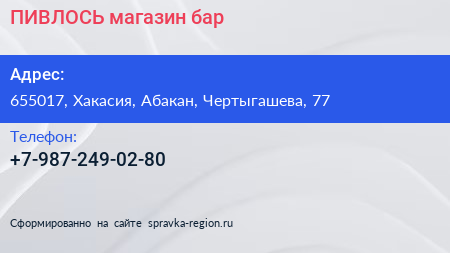 ПИВЛОСЬ, магазин-бар по адресу 655017, Хакасия, Абакан, Чертыгашева, 77 в дальнейшем Организация, размещена в следующих категориях: