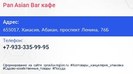 Pan Asian Bar, кафе по адресу 655017, Хакасия, Абакан, проспект Ленина, 76Б в дальнейшем Организация, размещена в следующих категориях: