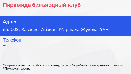 Пирамида, бильярдный клуб по адресу 655003, Хакасия, Абакан, Маршала Жукова, 99м в дальнейшем Организация, размещена в следующих категориях: