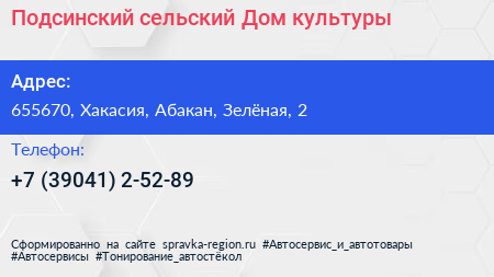 Подсинский сельский Дом культуры по адресу 655670, Хакасия, Абакан, Зелёная, 2 в дальнейшем Организация, размещена в следующих категориях: