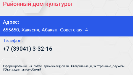 Районный дом культуры по адресу 655650, Хакасия, Абакан, Советская, 4 в дальнейшем Организация, размещена в следующих категориях: