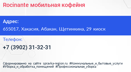 Rocinante, мобильная кофейня по адресу 655017, Хакасия, Абакан, Щетинкина, 29 киоск в дальнейшем Организация, размещена в следующих категориях: