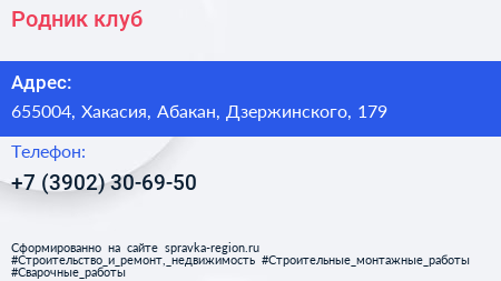 Родник, клуб по адресу 655004, Хакасия, Абакан, Дзержинского, 179 в дальнейшем Организация, размещена в следующих категориях: