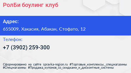 РолБи, боулинг-клуб по адресу 655009, Хакасия, Абакан, Стофато, 12 в дальнейшем Организация, размещена в следующих категориях: