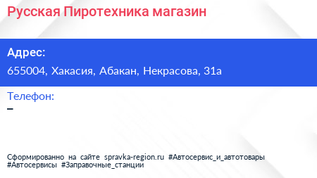 Русская Пиротехника, магазин по адресу 655004, Хакасия, Абакан, Некрасова, 31а в дальнейшем Организация, размещена в следующих категориях: