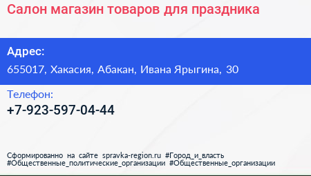 Салон-магазин товаров для праздника по адресу 655017, Хакасия, Абакан, Ивана Ярыгина, 30 в дальнейшем Организация, размещена в следующих категориях: