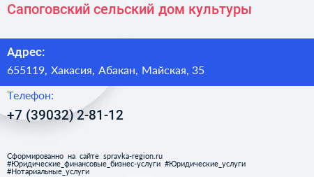 Сапоговский сельский дом культуры по адресу 655119, Хакасия, Абакан, Майская, 35 в дальнейшем Организация, размещена в следующих категориях: