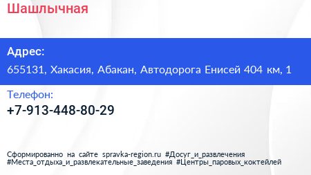 Шашлычная по адресу 655131, Хакасия, Абакан, Автодорога Енисей 404 км, 1 в дальнейшем Организация, размещена в следующих категориях: