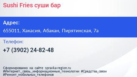 Sushi & Fries, суши-бар по адресу 655011, Хакасия, Абакан, Пирятинская, 7а в дальнейшем Организация, размещена в следующих категориях: