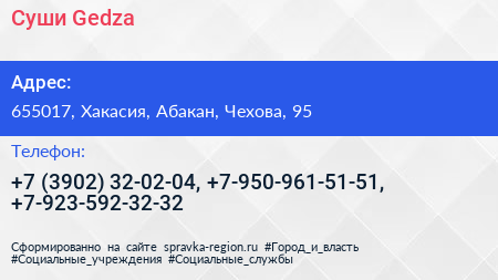 Суши & Gedza по адресу 655017, Хакасия, Абакан, Чехова, 95 в дальнейшем Организация, размещена в следующих категориях:
