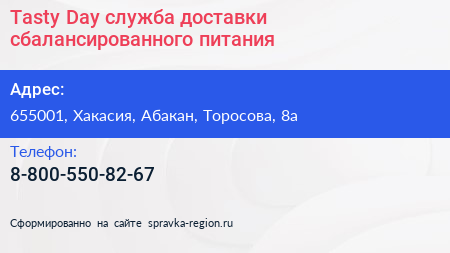 Tasty Day, служба доставки сбалансированного питания по адресу 655001, Хакасия, Абакан, Торосова, 8а в дальнейшем Организация, размещена в следующих категориях: