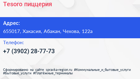 Tesoro, пиццерия по адресу 655017, Хакасия, Абакан, Чехова, 122а в дальнейшем Организация, размещена в следующих категориях: