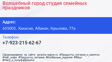 Волшебный город, студия семейных праздников по адресу 655001, Хакасия, Абакан, Крылова, 77а в дальнейшем Организация, размещена в следующих категориях: