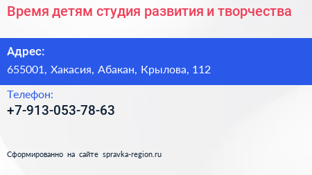 Время детям, студия развития и творчества по адресу 655001, Хакасия, Абакан, Крылова, 112 в дальнейшем Организация, размещена в следующих категориях: