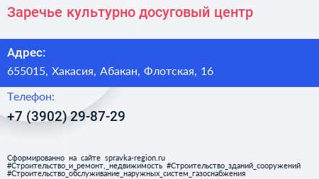 Заречье, культурно-досуговый центр по адресу 655015, Хакасия, Абакан, Флотская, 16 в дальнейшем Организация, размещена в следующих категориях: