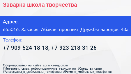 Заварка, школа творчества по адресу 655016, Хакасия, Абакан, проспект Дружбы народов, 43а в дальнейшем Организация, размещена в следующих категориях: