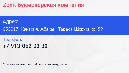 Zenit, букмекерская компания по адресу 655017, Хакасия, Абакан, Тараса Шевченко, 59 в дальнейшем Организация, размещена в следующих категориях: