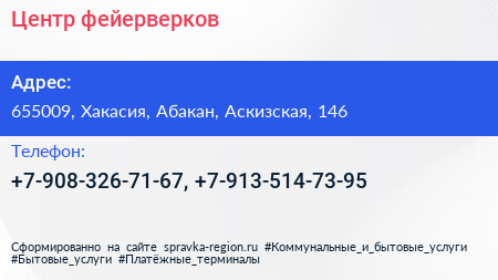 Центр фейерверков по адресу 655009, Хакасия, Абакан, Аскизская, 146 в дальнейшем Организация, размещена в следующих категориях: